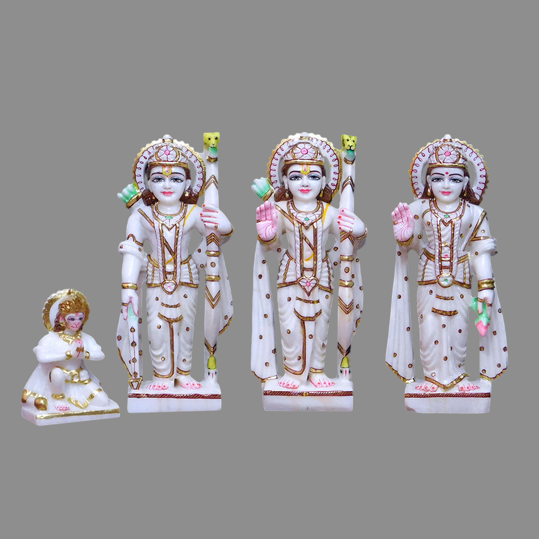 Ram Darbar Marble Statue crafted from premium Makrana Marble showcases Lord Ram, Laxman, Sita, and Hanuman Ji in divine elegance. These intricately hand-carved marble idols radiate peace, devotion, and positivity, making them ideal for any home temple or pooja mandir. The fine detailing with golden artwork enhances their spiritual beauty, adding charm and divinity to your sacred space or altar.