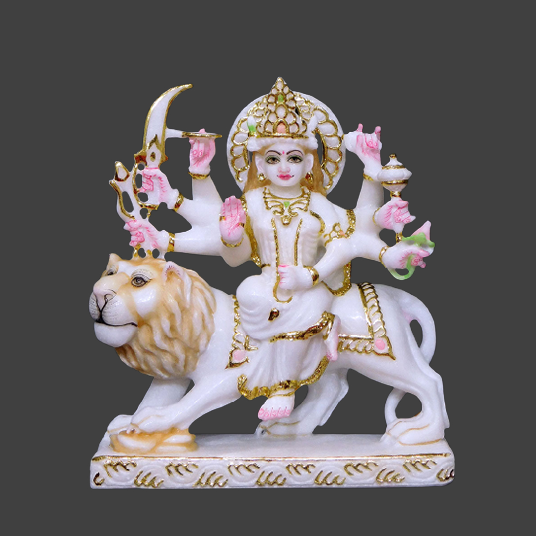 This Maa Durga Marble Statue radiates divine power and eternal grace, intricately crafted from pure Makrana marble. Depicted majestically, Maa Durga is seated upon a lion, adorned with eight hands that symbolize strength and protection. The golden detailing enhances its aura of opulence, making it a spiritual masterpiece that exudes energy and reverence.
