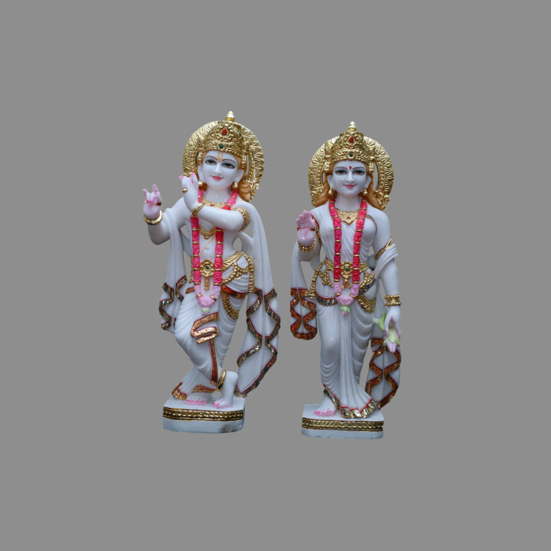 This Marble Radha Krishna Statue in Pink Maala with Gold Work is a masterpiece of divine elegance, handcrafted from premium quality marble. The intricate gold detailing and vibrant pink garland enhance the charm of Radha Krishna, radiating love, devotion, and prosperity. Perfect for home temples, gifting, or décor, this idol brings spiritual grace and timeless beauty to any space