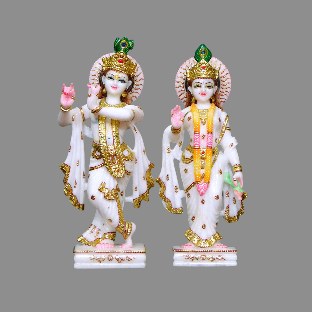 This Radha Krishna Marble Statue is beautifully carved from pure Makrana white marble, symbolizing divine love and eternal beauty. The Makrana marble Radha Krishna murti features a smooth finish, intricate detailing, and a finely crafted peacock feather (mor pankh) that adds a touch of grace. Ideal for a home temple, pooja room, or mandir décor, this Radha Krishna idol radiates spiritual bliss, devotion, and timeless elegance.