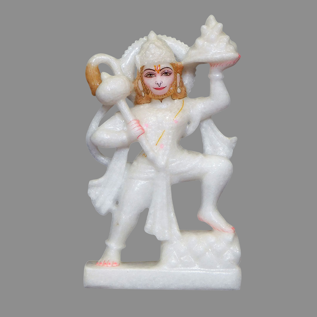 This divine Veer Hanuman Ji Makrana White Marble Statue is meticulously handcrafted from pure Makrana white marble, featuring a smooth finish and intricate detailing. The sacred Hanuman Ji idol radiates strength, courage, and divine energy, making it perfect for home temples, pooja rooms, and spiritual décor. Ideal for invoking positivity and removing obstacles, this finely crafted marble Hanuman murti beautifully captures the mighty presence of Hanuman Ji lifting the mountain.